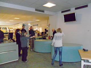 Så kom de nye skranker! Hvordan mon den helt rigtige placering vil være? Skal de stå parallelt med væggen? Skal de stå vinkelret på? Der tænkes og tales, peges og vises.